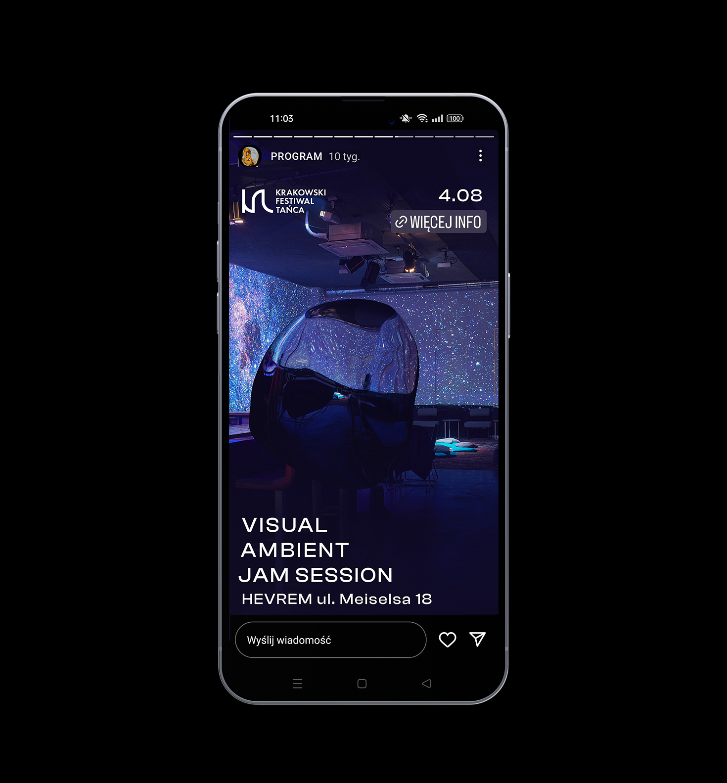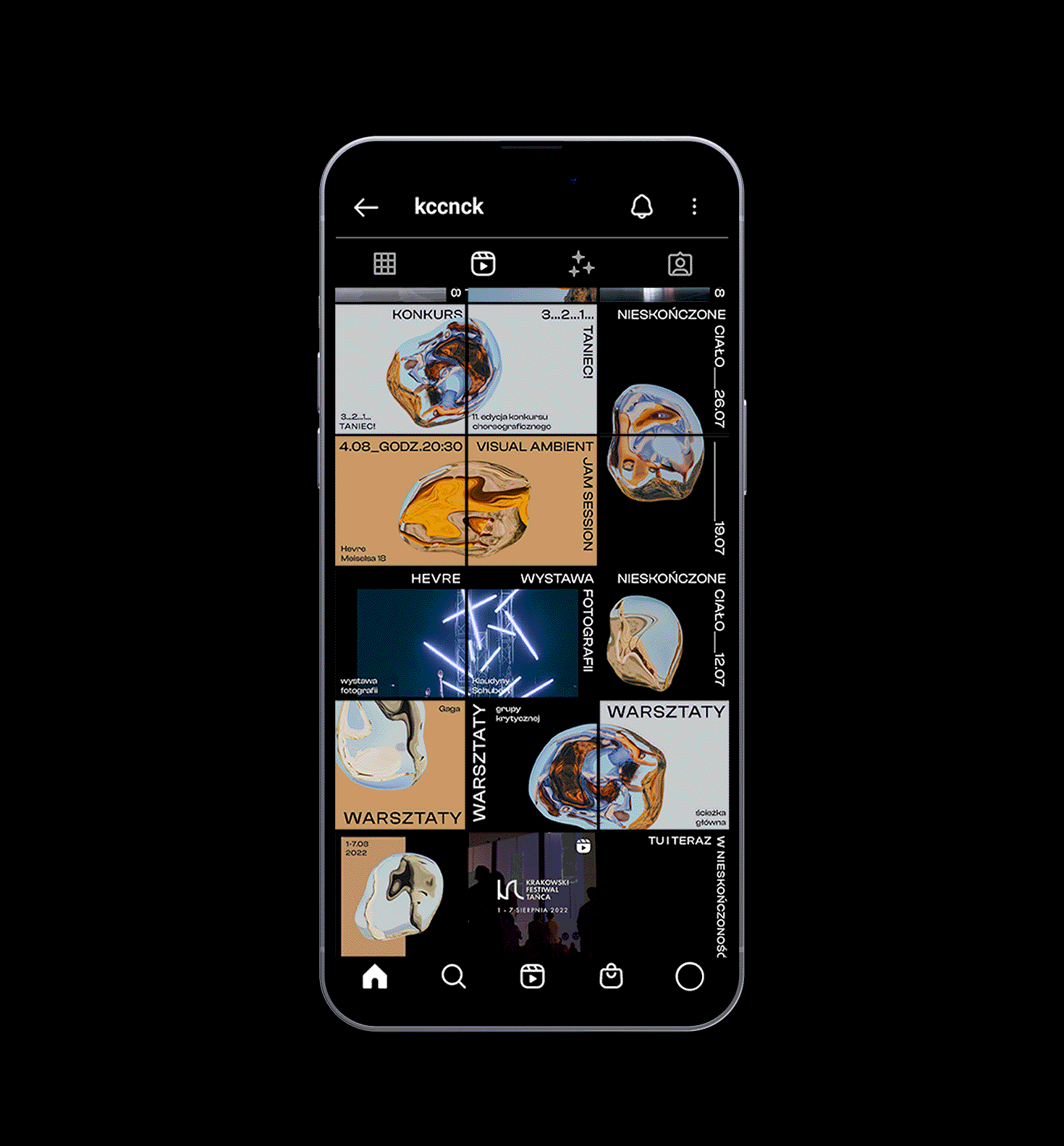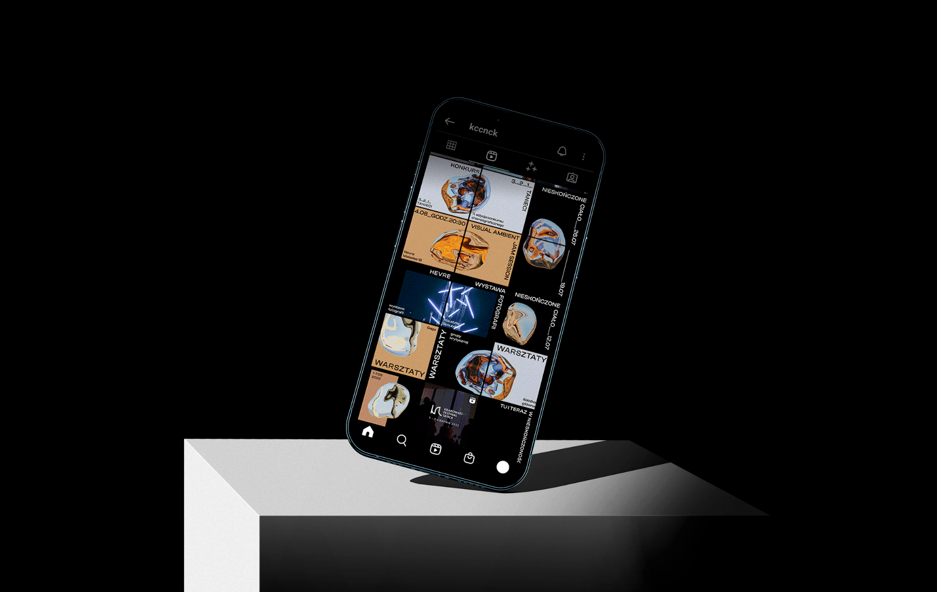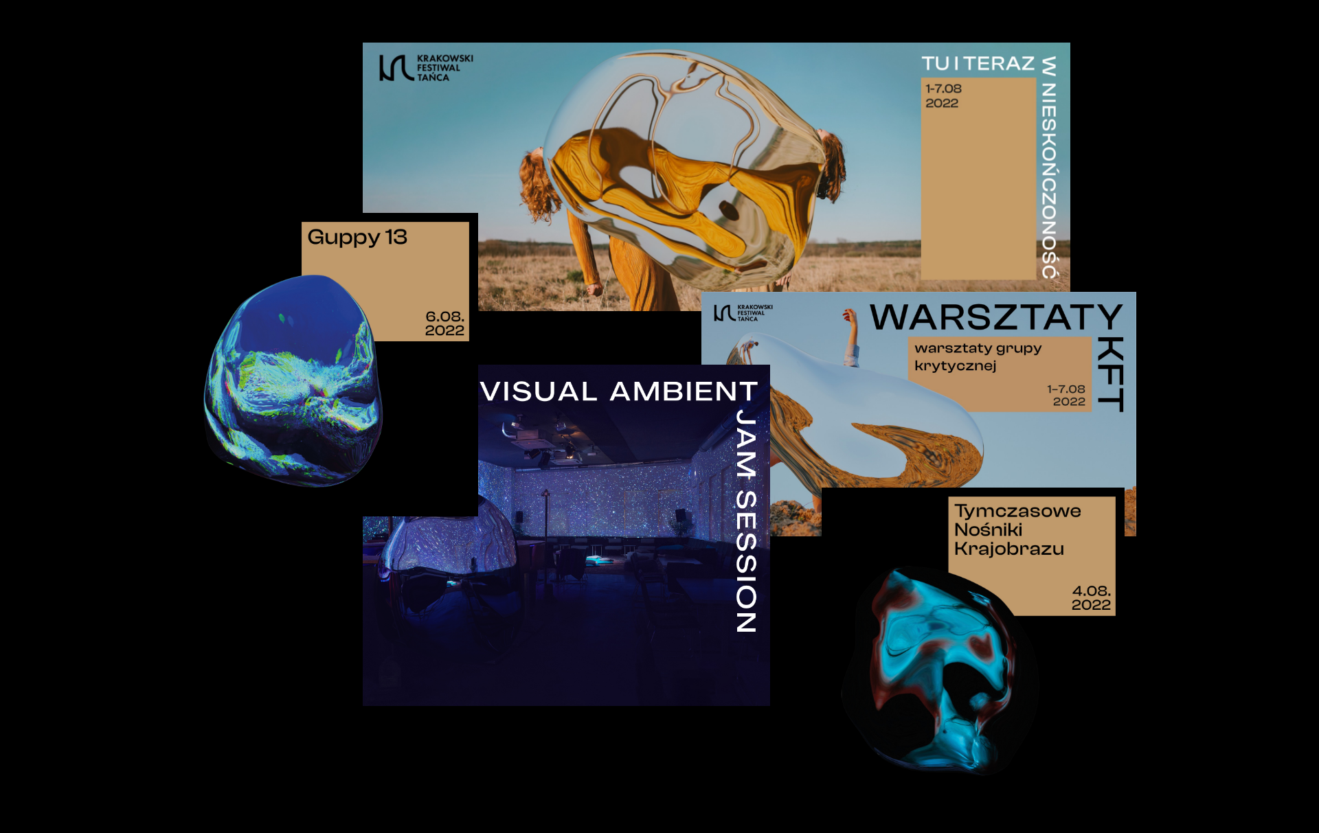 Projekt łączy w sobie różnorodne techniki i kompleksowe myślenie o identyfikacji festiwalu jako o pewnego rodzaju opowieści. Główny wątek narracji skupia się wokół motywu graficznego – wyobrażenia srebrnego portalu – który materializuje się w zarówno w rzeczywistej przestrzeni pod postacią trójwymiarowej rzeźby, jak i przestrzeni cyfrowej (filtr AR na instagramie). Dzięki temu odbiorcy mają szansę wejść w interakcję z symbolem identyfikacji na podobnej zasadzie, jak dzieje się to na materiałach promocyjnych. Hasło festiwalu “tu i teraz w nieskończoność” odnosi się także do samej identyfikacji, która miała okazję zaistnieć w każdym uniwersum – rzeczywistym, fizycznym jak i wirtualnym/cyfrowym.
