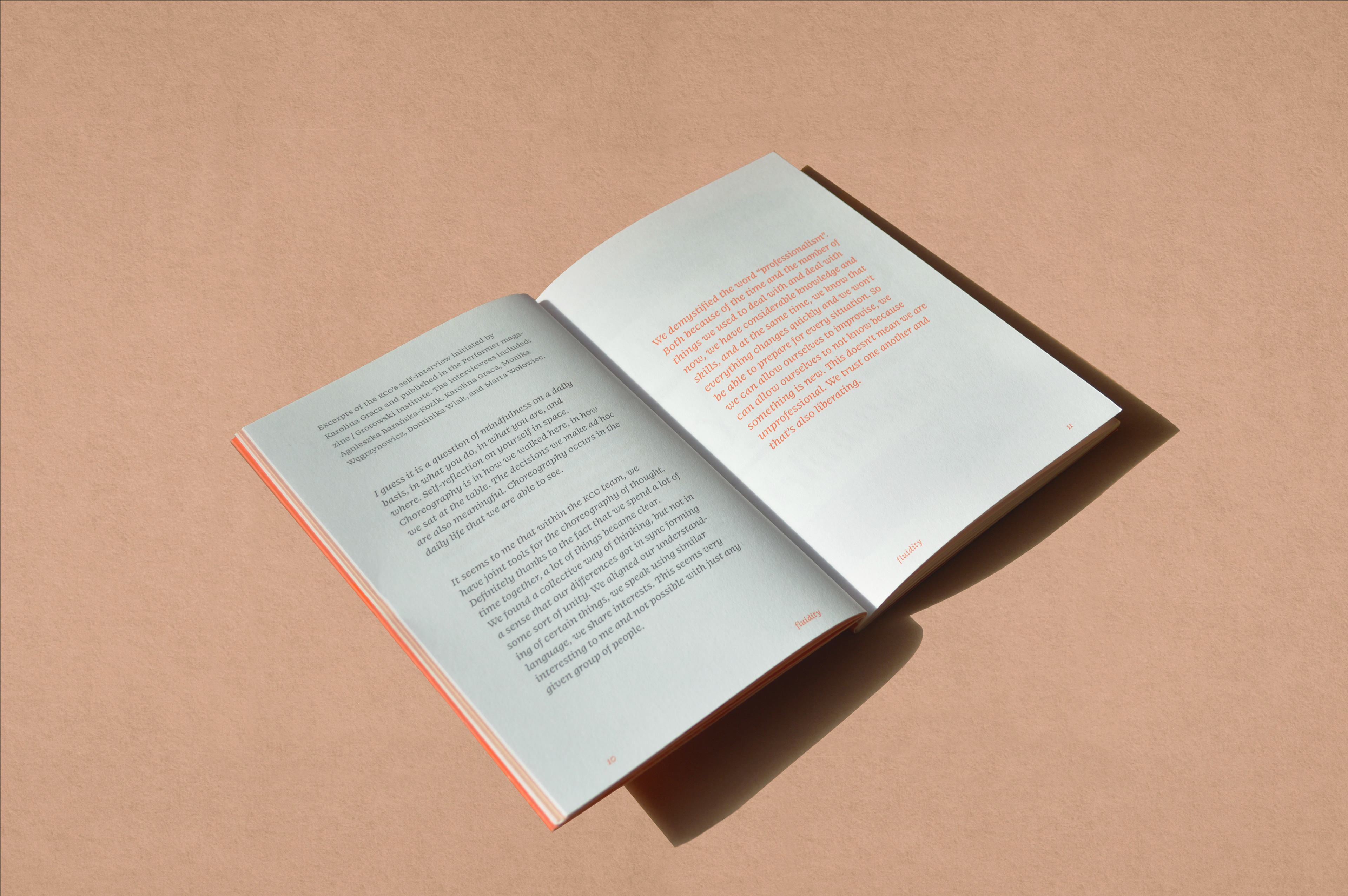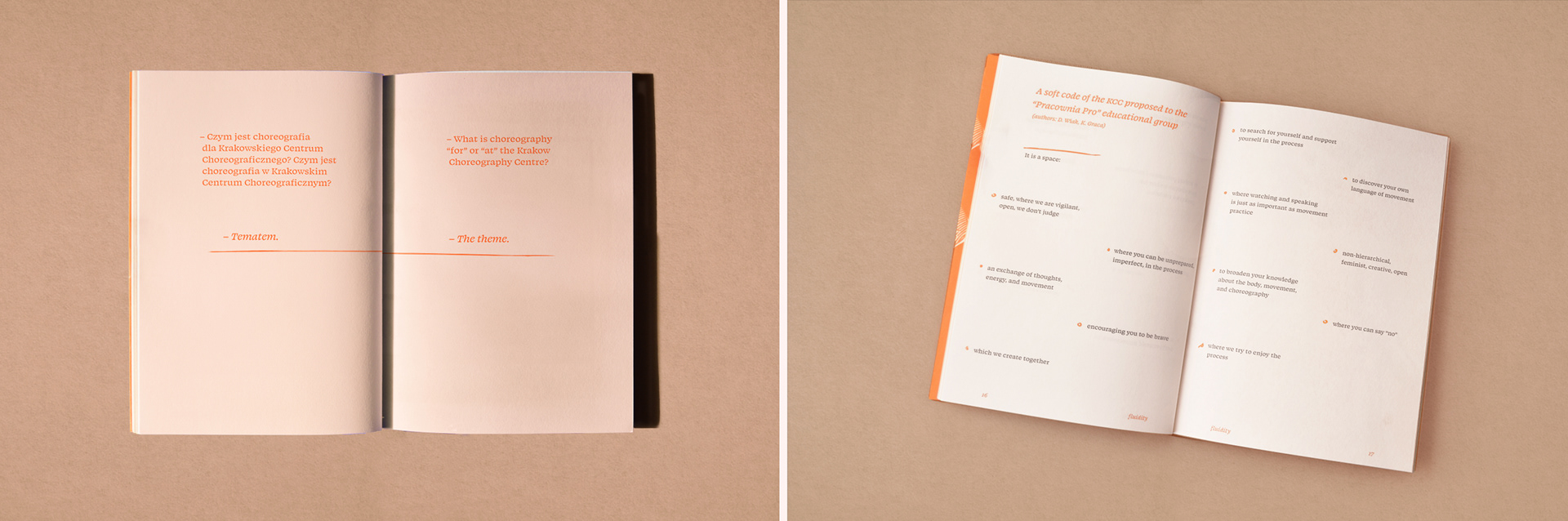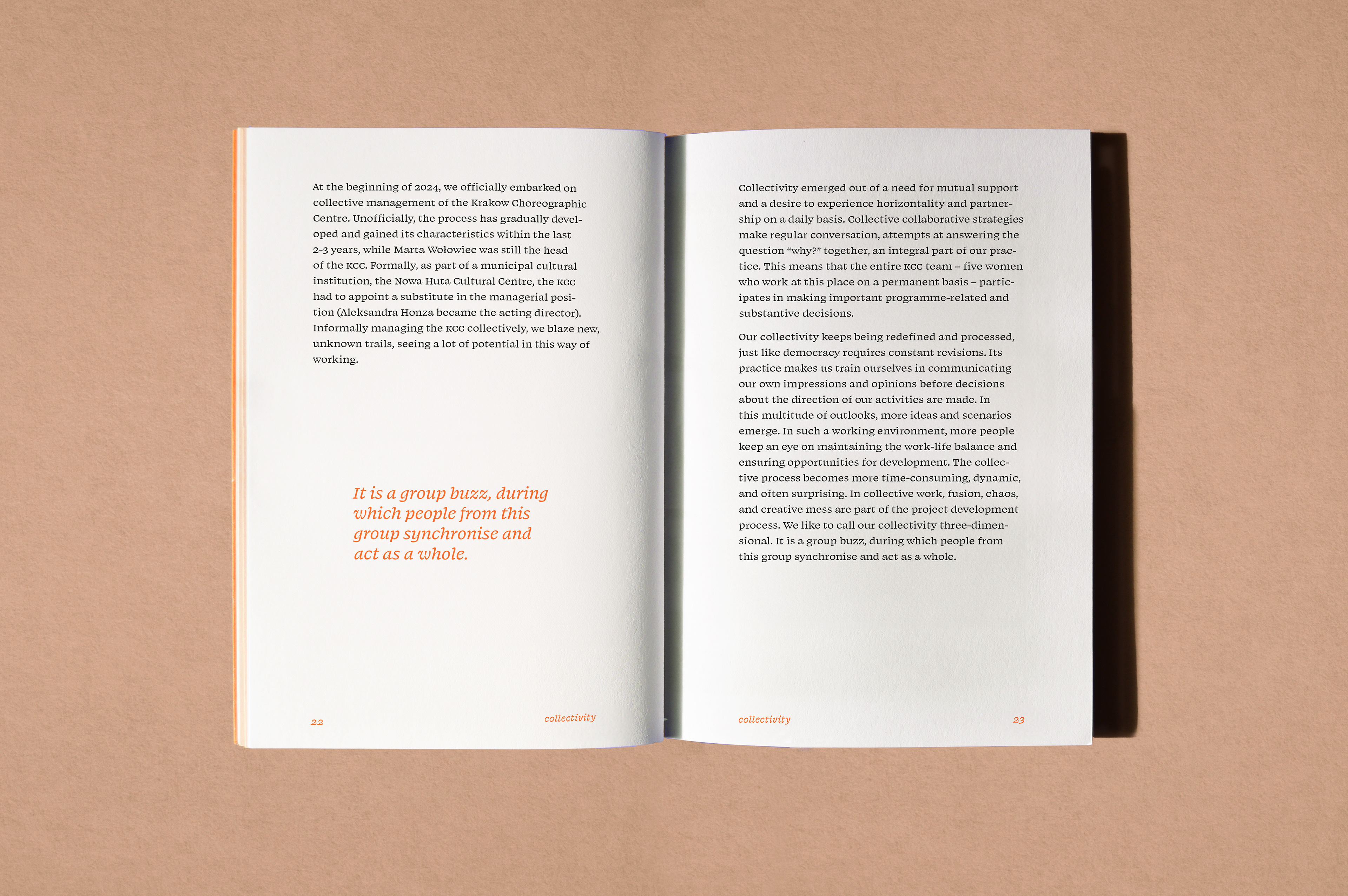 Publikacja została stworzona z okazji 10-lecia działalności Krakowskiego Centrum Choreograficznego. Nie znajdziemy w niej zdjęć, wykresów, tabel, ani sentymentalnych wspomnień. Jest manifestem działalności w sposób kolektywny, miękki, wrażliwy, a także wyraz wdzięczności dla wszystkich osób współtworzących Krakowskie Centrum Choreograficzne.